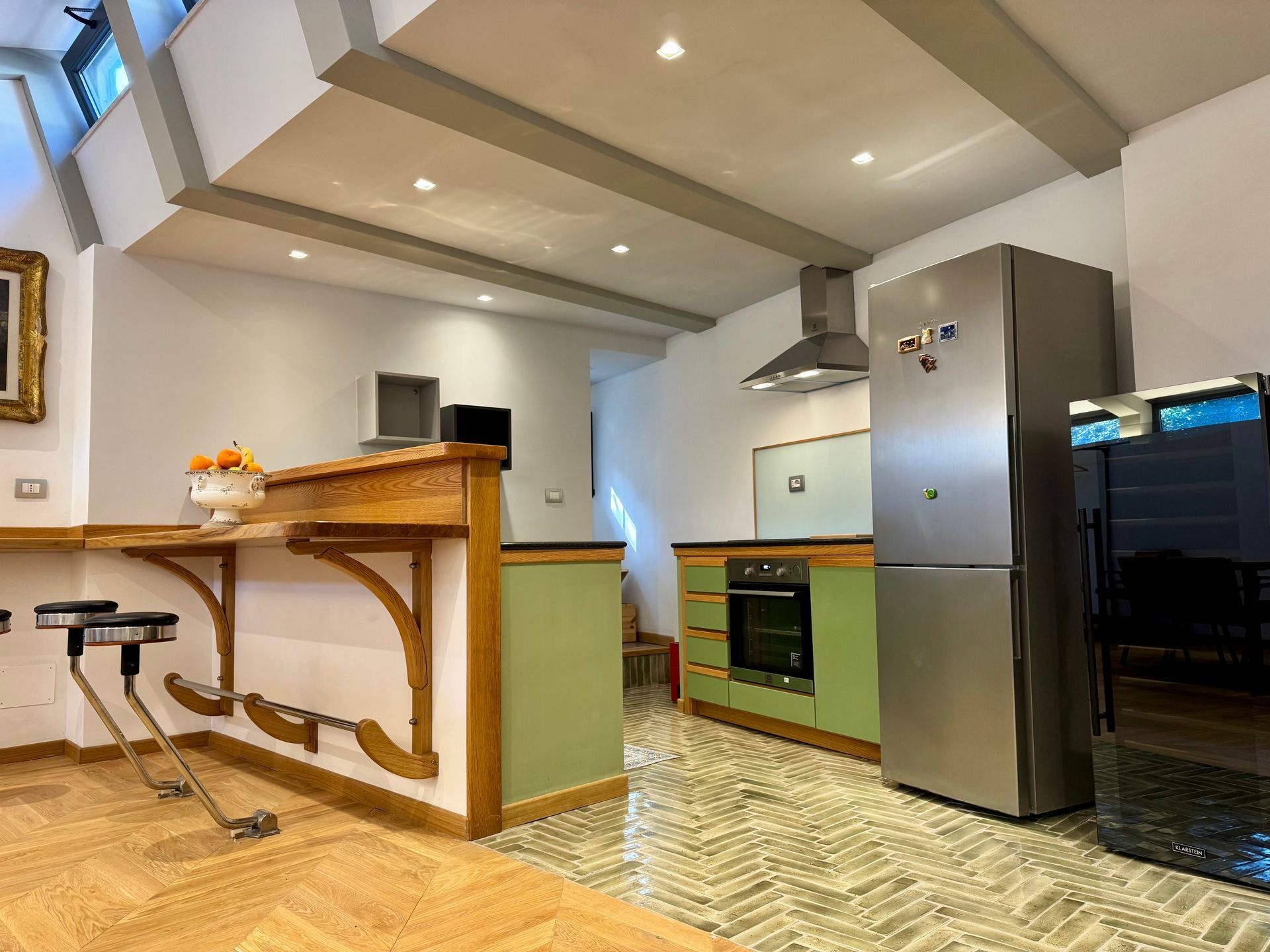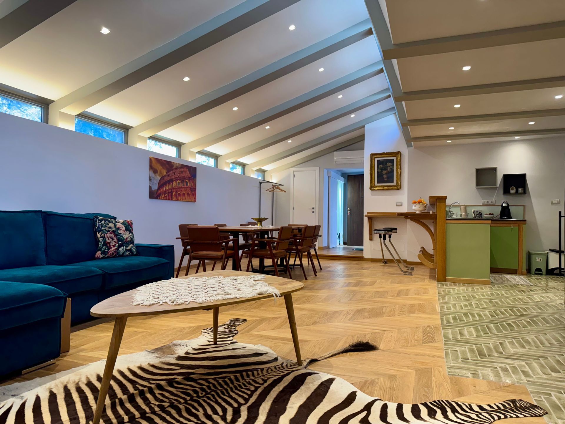 Your private realm in Rome in the vibrant Aventino neighborhood awaits you through a private gate, an inviting path, and some stairs to your private door. Then enter! With soaring, beamed ceilings, this strikingly stylish, light-filled, one bedroom apartment will delight you at first sight. A perfect fusion of modern luxury and eclectic design, this 100 sq meters expansive, open-spaced retreat offers a true Roman home experience.