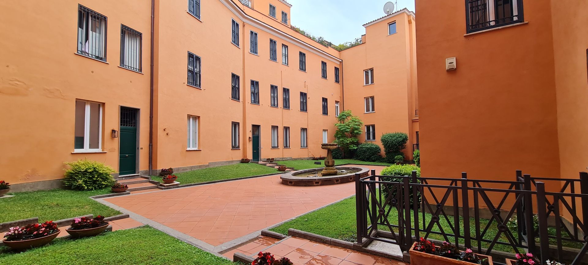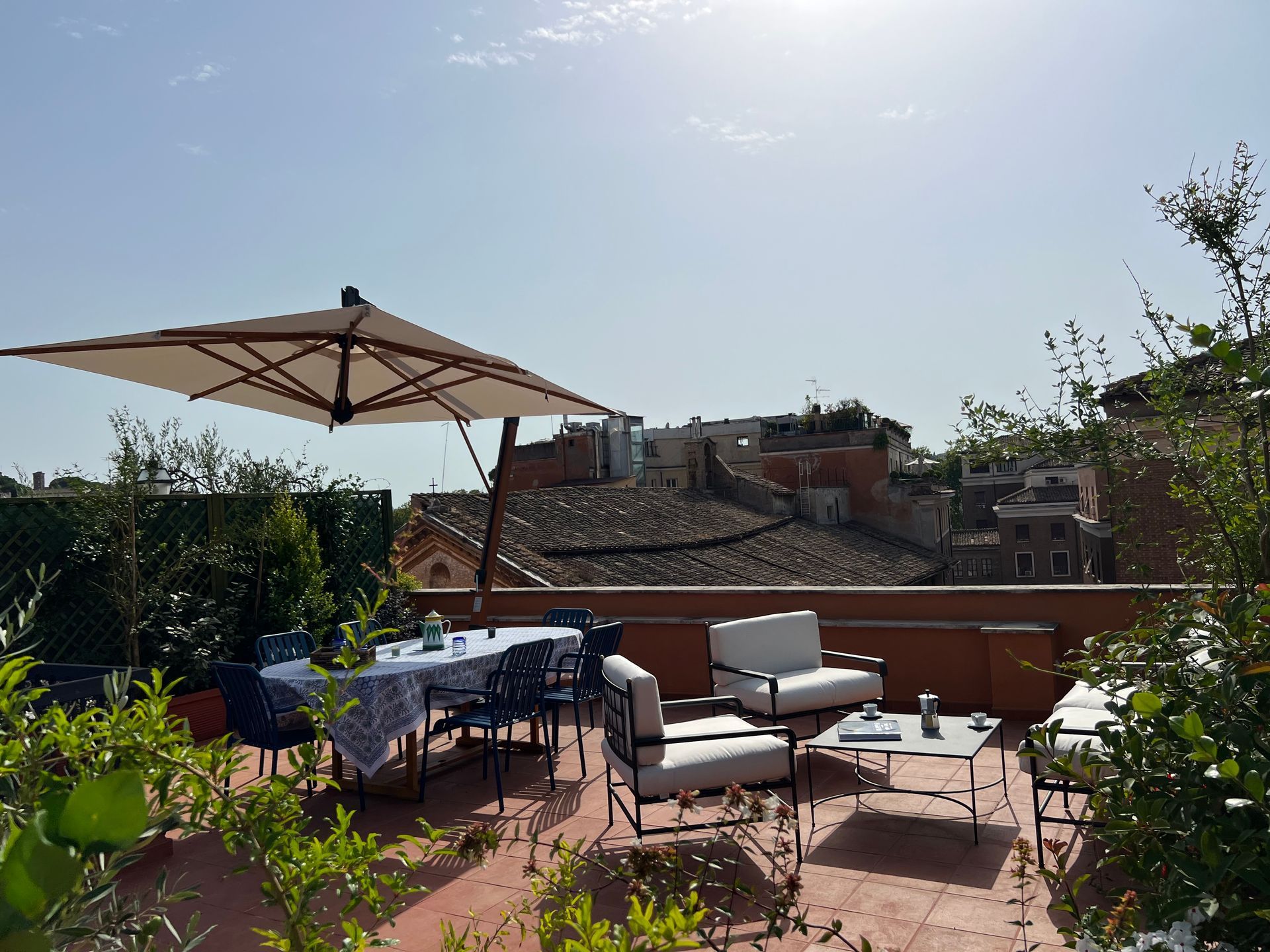 The true magic, however, lies outdoors. A private rooftop terrace crowns the residence, complete with an outdoor kitchen, dining table, and lounge areas. It is the perfect setting for a quiet morning coffee as the city wakes, or an evening aperitivo as the stones of the Arch of Janus glow in the sunset. Below, the shared cloister garden—with its fountains, greenery, and resident turtles—offers a peaceful refuge that feels worlds away from the lively streets beyond.