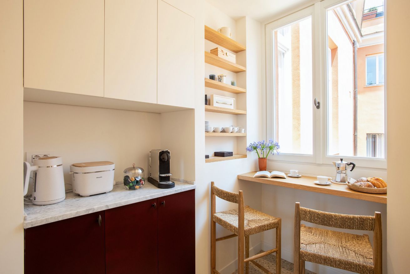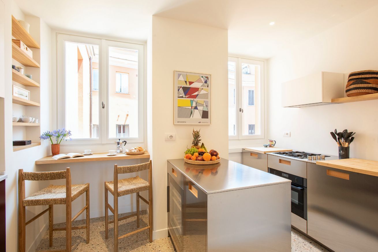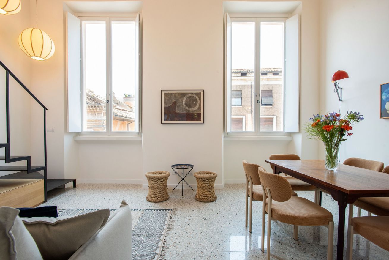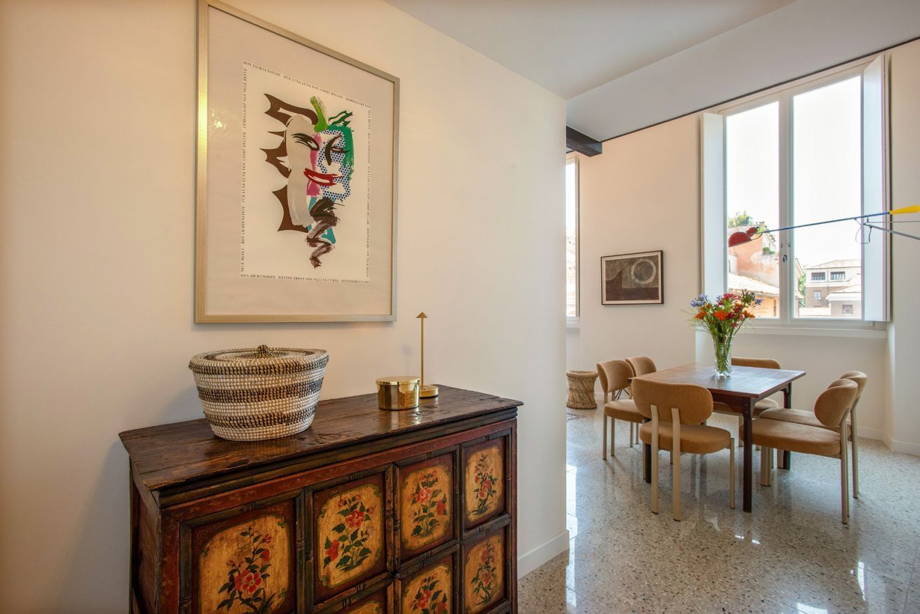 Inside, the home unfolds across two levels, creating a natural sense of space and privacy for families or two couples traveling together. Each floor offers a queen bedroom and its own bathroom, while the living areas are thoughtfully designed with curated art, warm textures, and the inviting feel of a lived‑in Roman home. A fully equipped designer kitchen, Wi‑Fi, air‑conditioning, and a washer/dryer make longer stays both easy and comfortable.