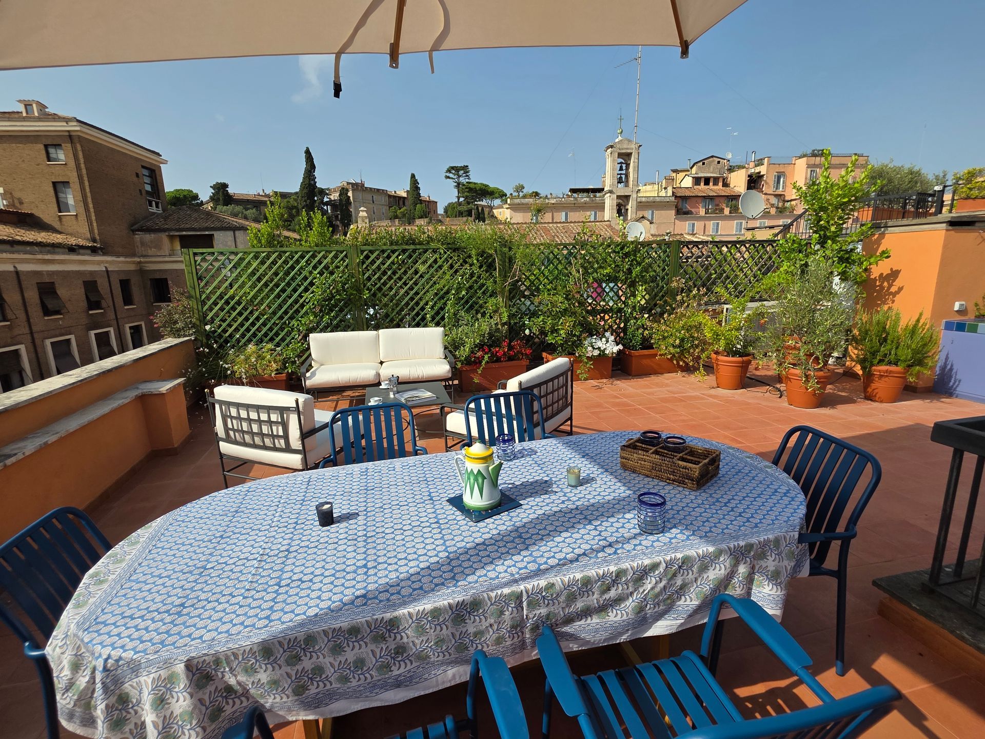 Tucked within the walls of a beautifully restored Renaissance cloister, Forum Terrace offers a rare kind of Roman retreat: a spacious two‑level residence with complete privacy, serene gardens, and a rooftop terrace overlooking the ancient Arch of Janus. It is a place where history, comfort, and quiet elegance come together effortlessly—just steps from Piazza Venezia and the Roman Forum.