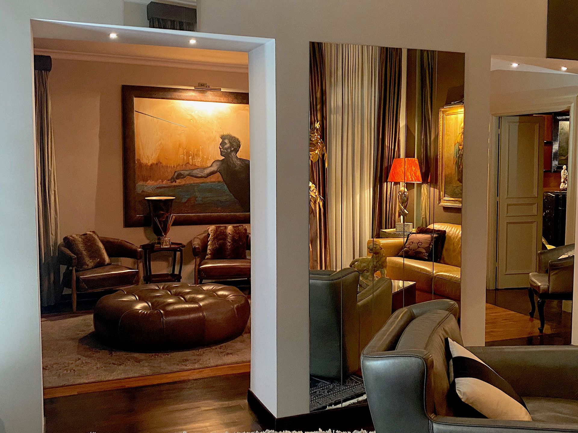 Owned by a significant Italian movie producer and Artistic Director as well as collector of art with extraordinary taste, it is resplendent with his personal selections to give you just that "aah" moment! With living and dining room in darker hues, ebony furniture, dramatic lighting, and stunning sculptures.