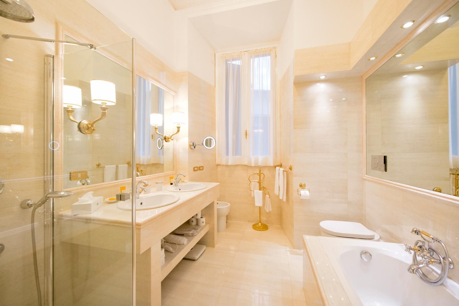 Private Terrace: ideal for some relaxing moments outdoor, an aperitivo or even to have breakfast in your suite.The Master bedroom: offers a double canopy bed, a Smart TV connected with the satellite service offered by Sky and a decorated fireplace with a beautiful painting above. There is also a second contiguous bedroom with another 2 single beds. It is also possible to request a cradle for your child. The bathroom has a bathtub with shower and a double wash basin.
