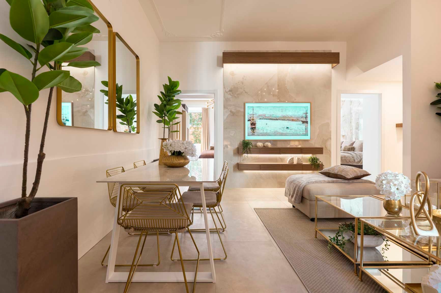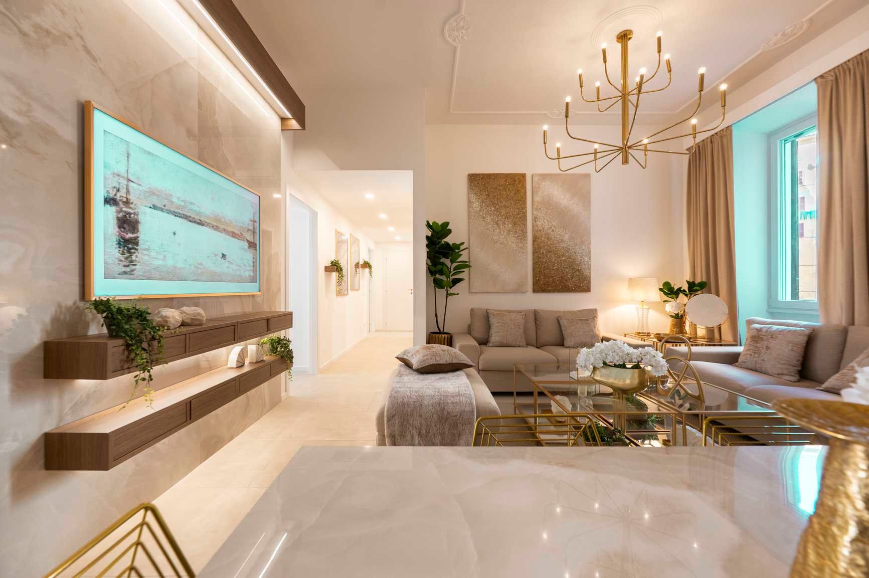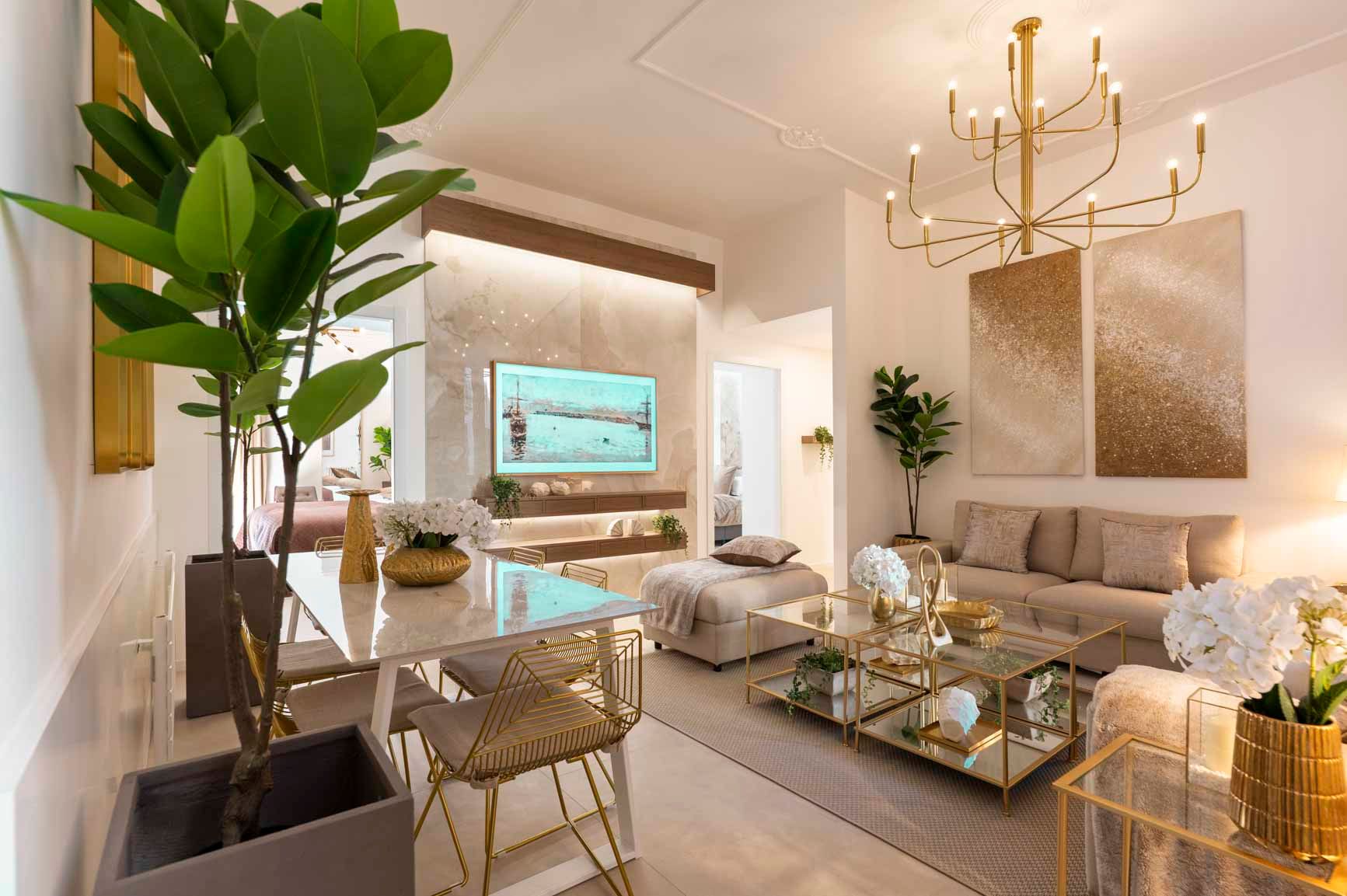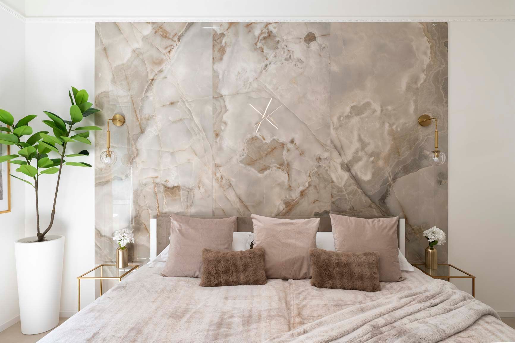 The spacious and gracious living room and dining space accommodate up to six guests and is a great place to gather. There is a 65-inch smart TV. The original artwork by talented local artists adds further to the ambiance of sophistication and style. The spacious sleeping accommodation offers three beautifully designed bedrooms featuring super king beds which insure a restful night’s sleep. Marble accents and ample closet space will also be appreciated. There are two beautifully appointed marble bathrooms with Roman travertine stone and walk-in showers, providing a spa-like experience, too.