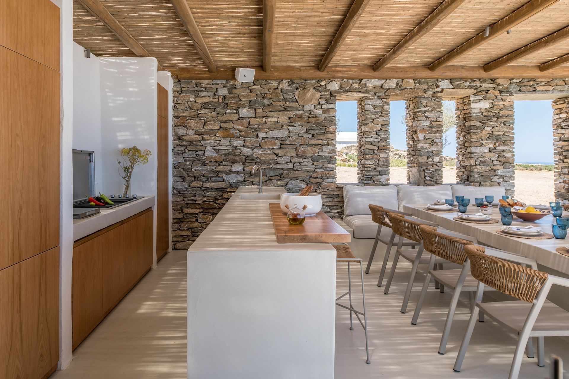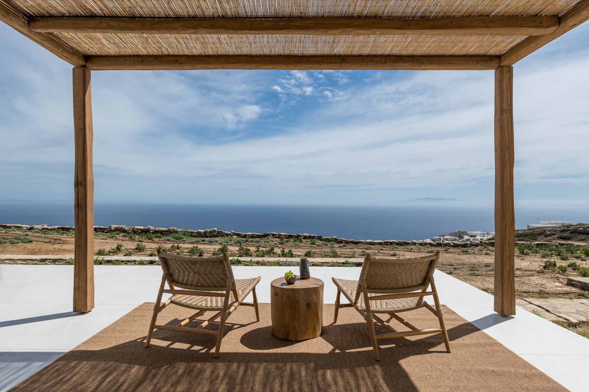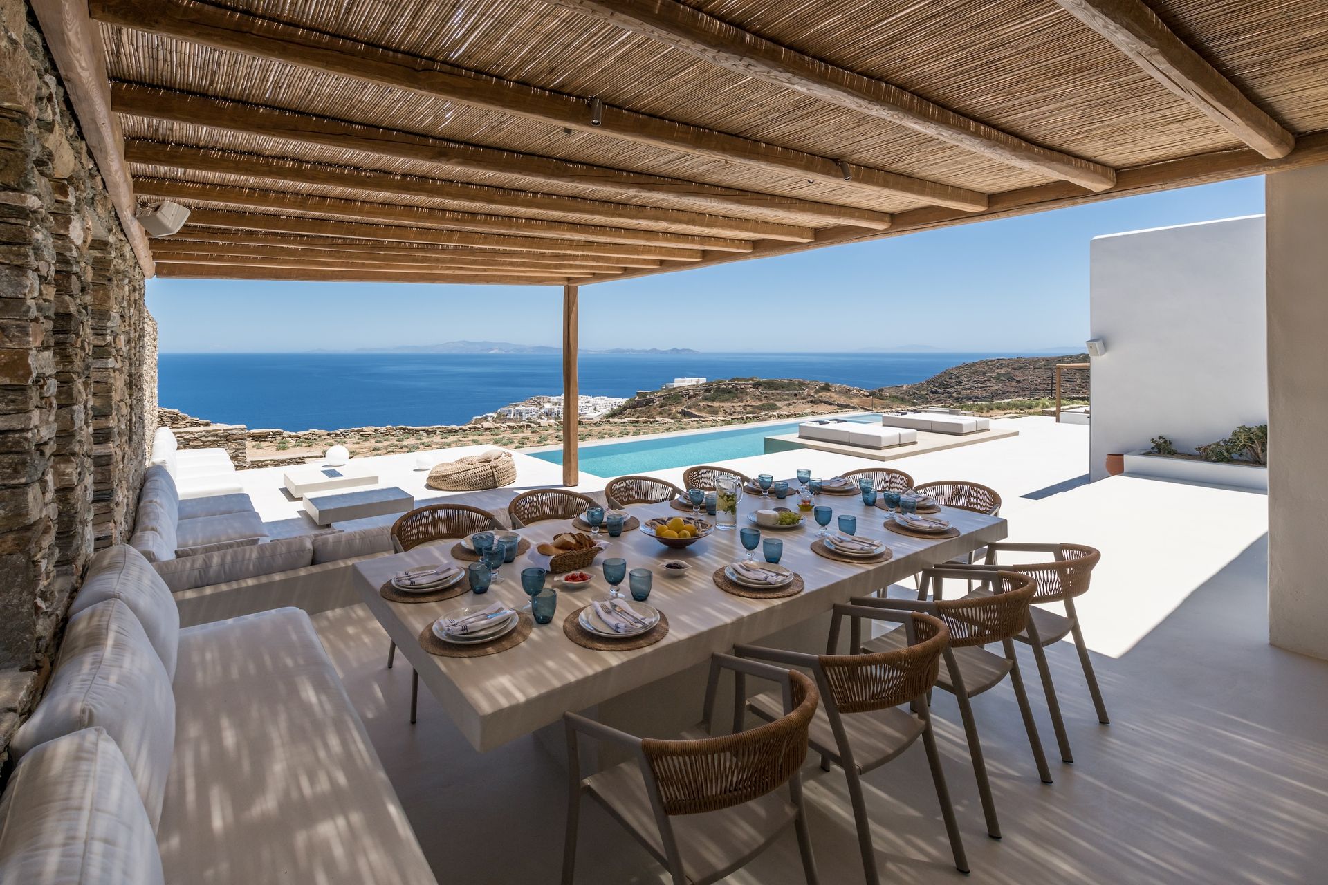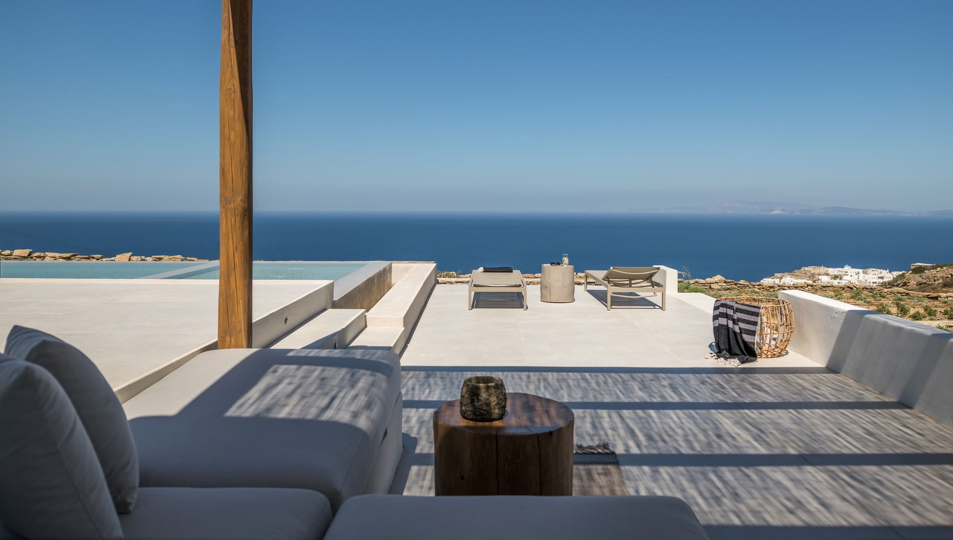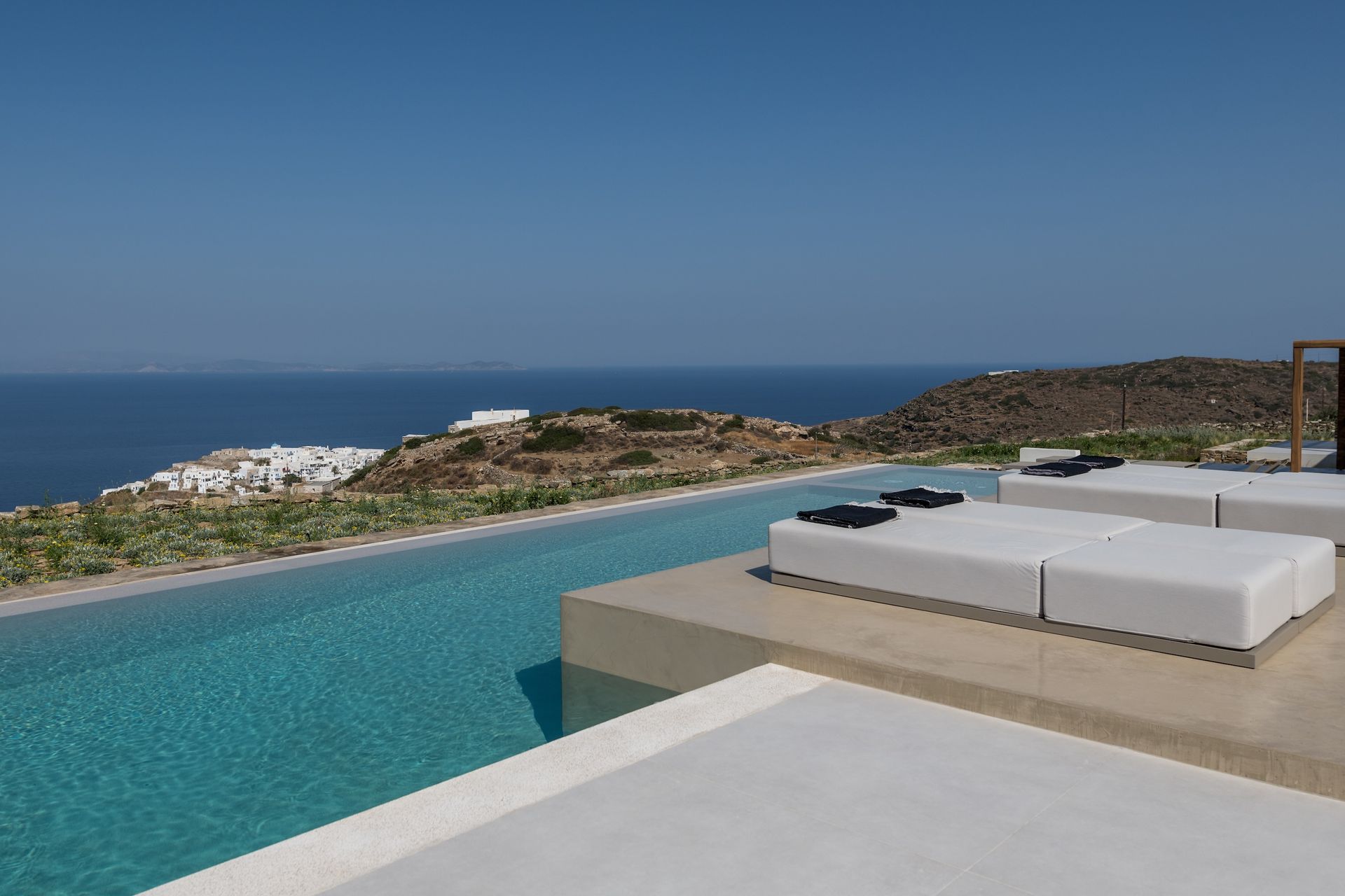 Outdoors, it's as inviting as inside. A large heated infinity pool, which enjoys a fresh sea breeze , is bordered with comfortable sofas. Whether you swim or read a book, you have the turquoise sea as your view as your day unfolds under a sunny blue sky.