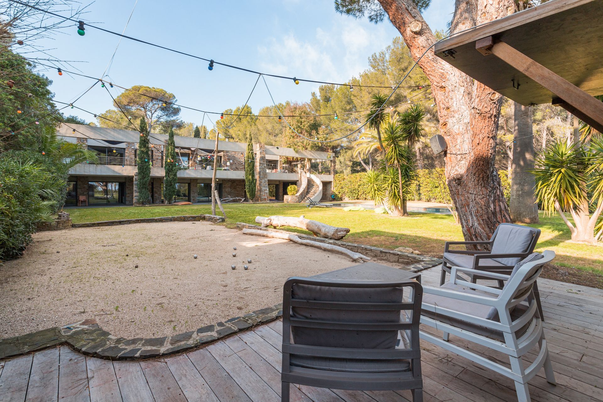 Upon entering, you’ll be greeted by a bright, spacious and airy living area, complete with a fully equipped kitchen, a welcoming dining room, and a lounge featuring a stunning hanging fireplace. On this level is also the master bedroom with its work desk, lounge, dressing room and en-suite shower room From the living area, large sliding windows seamlessly connect the indoors with the terrace, and offer a view of the surrounding pines and the Gaou Bay. The expansive terrace is perfect for enjoying al fresco meals, morning coffees while watching the sunrise, or simply soaking in the sun. The garden, accessed via a charming stone staircase, is an oasis of green, graced by a heated pool, a wooden bar, and a pétanque court—ideal for fun-filled afternoons. On the lower level, you'll find five comfortable bedrooms, including a master suite with an en-suite shower room. The layout is perfect for families, with two sets of rooms sharing convenient bathrooms. All bedrooms open onto a covered terrace that leads directly to the lush garden and pool area.